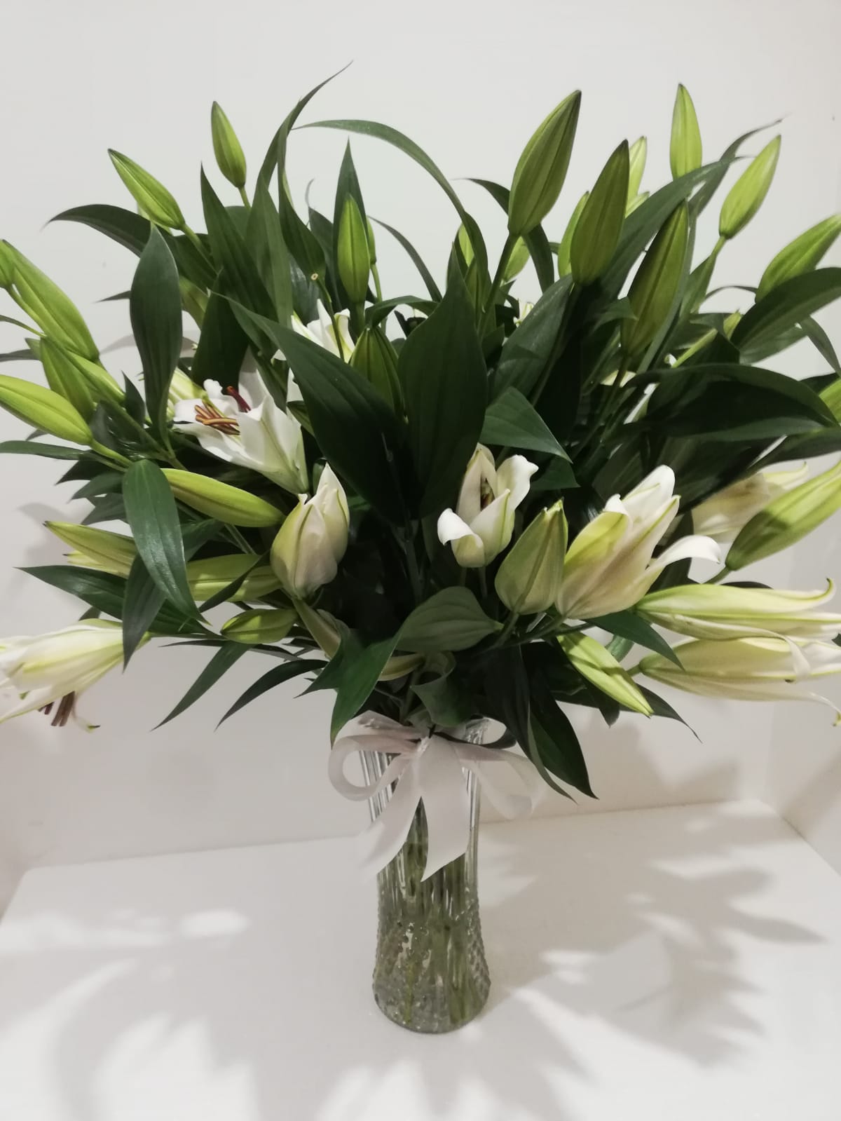 Florero de 1o Lilium Asiáticos color blanco acompañados con Mables del mismo tono, todo en un florero de vidrio liso trasparente.