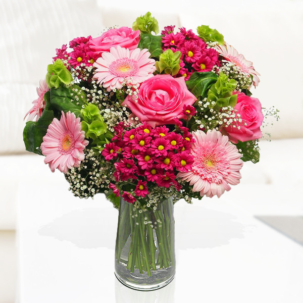 Florero de vidrio con flores silvestre en tonos rojo, contiene Gerberas, Mables y otras flores de la estación
