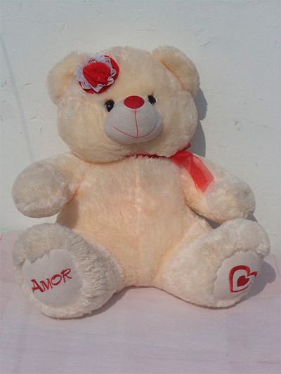 Oso de peluche grande 60 Cms. con ramo de 12 rosas ecuatorianas acompañado de una botella de espumante, bombones Varsovienne y dos copas de vidrio.